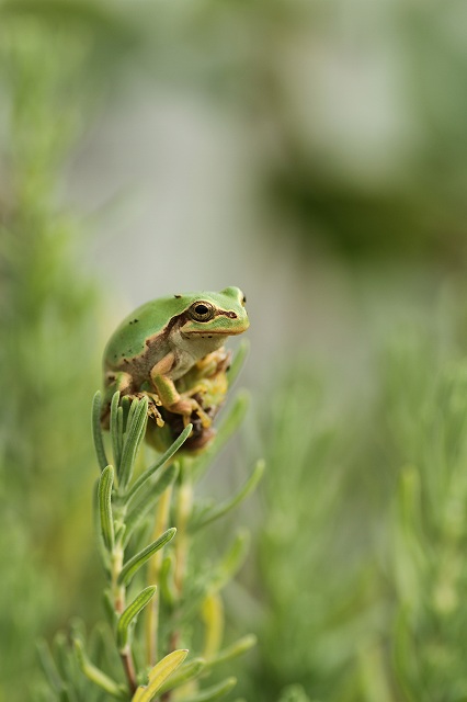お花に水やりしてると、ぴょんと飛び出すものあり・・・可愛い感じのかえる君です。ラベンダーの中に飛んで行きました。慌ててカメラを取りに入りました。まだいるいる、ね可愛いでしょう?写真に撮って見ると不安定な、ラベンダーの花圃に捕まり、何だか 「僕の事追っかけないで」 と言ってるように、見えました。可愛いかえる君ですが、こんな場所でも向きを変えようとして居ます。カメラが嫌なのでしょうねぇ~・・・・ごめんね~~~~~~~~~~~~~~~~~~~~~~~~~~~~~~今日もまた暑い暑い猛暑でした。だんだんやる気がなくなっていくのが良く解ります。暑さに疲れてきてるんですねぇ~、もう一頑張り!でなく もういいや!になってしまうんです。