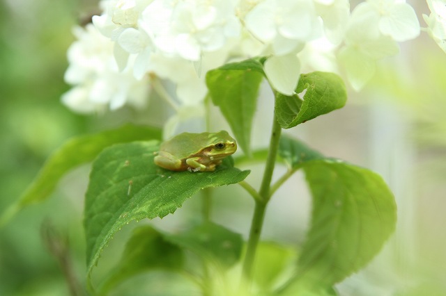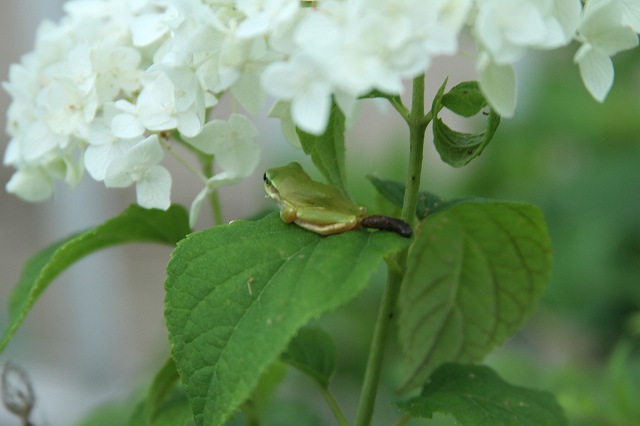 小さな訪問者が居ましたよ丁度西洋紫陽花「アナベル」の葉っぱの上に居ます。アナベルまだ咲いてるんですよ。 今もちょっと見てきました。朝からずっと同じ場所に居ます。お首を上に上げてる時があったので、撮ろうとしたら、引っ込めて終いました。これは警戒のポーズなんですねぇ~少し周りを優しい感じにぼかし気味に・・・・かえるの頭と向こうの葉っぱが重ならないような位置まで動いて、意識したんですが・・・・ぎりぎりですね。お盆にも四国までは出かけられませんので、御仏前のみ(両方に)私は、祖母、両親、兄、妹、とこちらで拝んで 主人は両親と姉、何だかあちらの方が賑やかですねぇ~こちらは寂しいです。~~~~~~~~~~~~~~~~~~~~~~~~~~~~夕方5時見に行きました、向きだけ変えてまだおんなじ所です。一日中干からびないのかな?熱中症にはならないのかなぁ~ 餌は何時捕るんだろう?心配だなぁ~これ5時の写真です。こっち向いたでしょう・・・・・・気になる