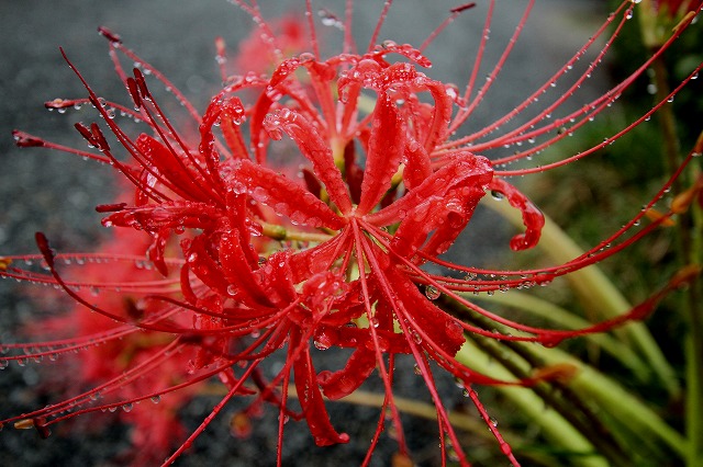 国定忠治の子分で三ツ木の文蔵の生まれ故郷三ツ木に今彼岸花の名所が有るんです我家からは、車で15分位でしょうか、今日雨が止んだ午後のちょいの間行って来ました。今奇麗に満開状態でしたこの一枚は、午前中雨の中 傘を差して御近所さんの入り口に咲いているのを写してきました。花車のようでしょう 雨が重くて、しなってるんです。此処からは三ツ木です↓真っ白ではないのですが、クリーム色かなぁ~本当に何年か前は5,6輪位だったのが今では沢山になって居ます。私を見てと言わんばかりに、他の花より、高く咲いて居ます雨 霧雨 これは本物、霧吹きではありませんよ!でっかい木の雨の筋や苔が面白いなぁ~と思って・・・(もっとアンダー補正が欲しいかな)いじっていません↑こんなのが、今頃いましたバックは彼岸花です二匹もいましたよ、賑やかに、暑い夏を鳴いたことでしょうね その頃にはお花はまだ咲いてなかったでしょう今年はお花が10日遅いとか・・・今盛りが入れ替わって居ますね三ツ木の文蔵もまさか彼岸花の名所になるとはお釈迦様でも・・・・・知りますめぇ~