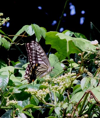 今日は郵便局までの道でアゲハ蝶の乱舞です今迄本当によく通る道の側なんですが感激感動・・・でカメラが震えて居ます。ははは一匹では震えていませんよ可愛いでしょう、この雑草が大好きのようですねさてさて 本当に一杯アゲハ蝶がいたのよ!は~い 二匹まとめて めんどうみたよぅ~は~い4匹 乱舞始める これでは、作品には成りません!5匹になると こちらも、興奮して早く早くと気ばかり焦りまして、この程度、手振れ補正付いたLレンズで、この有様・・・良い瞬間を逃してしまいました。交換レンズ(EF70-200f2.8L IS USM)情け無い 今頃落ち込んで居ます。もっと早いシャッター速度じゃないと、捉えられないことがわかりました。TV優先にはしてたのですがもっと速度が要ったようです・・・一匹だとねぇ~まだ落ちついていられるんですが・・・これ位が 落ち着いてますかねぇ~これも二匹なの ラブラブかなぁ~兎に角今日は良い経験をしました。案外シャッター速度も速く無いと駄目な事もわかりました。アオスジアゲハにも出会いましたラッキー可愛いでしょう、余り出会ったことの無いアオスジアゲハちゃんです。まぁ~今日は蝶ちょで日が暮れました。こんなに出会える日も本当に珍しいです。