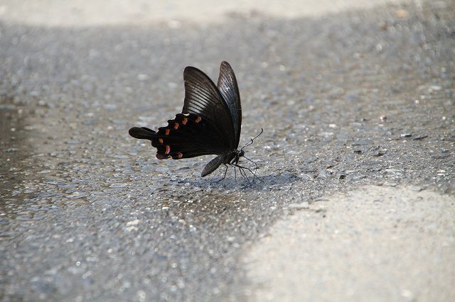 ふっと外を眺めると黒いものが、道路の水が染み出てる所にいる。カンが働く蝶かな?当たって居ました。今まで実物見たことの無い、「ミヤマカラスアゲハ蝶」ですラッキーですと言っても案外車の通りの多いところ・・・自分が、車にはねられないように・・・ゲットしました。見てね!まずは遠くから望遠で遠慮がちに・・・水を飲んでるんです。こう言うことも解りましたよ。この蝶は水は飲むけど直ぐにお尻の方からポタポタ落として居ますネットより・・・・開張78~132mm、前翅長61~72mm。幼虫はキハダ,カラスザンショウをよく食べます。♂は前翅に見られる黒い毛の様な帯が特徴最後にはこんなに仲良くなって、おいでもっとこちらに、そう言うと私の足元に来るんです。自分でも不思議だなぁ~と思いましたよ。私の周りクルクル回って又水飲むのよこっち向いてよと言うとクルット回ってくれました。お尻の所から、水がポタポタ落ちて居ます綺麗でしょう お尻の水が良く解るかな? 車にプーなんて言わされながら・・・・道路が此処は濡れてるんです・・・でお水飲んでます。~~~~~~~~~~~~~~~~~~~~~~~今日は又特別暑いですねぇ~夏祭りのボランティアが入って今日は4時過ぎより3人で出かけます。青空ライブになりそう、始めての経験です。