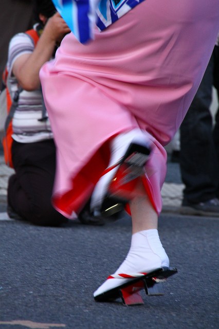 群馬高崎どですけ連の 阿波踊り 始まり~♪ 瓢箪ばかりが浮き物か、私の心も浮いてきた、ア~ラ えらいやっちゃ!えらいやっちゃ!よいよい!よいよい!トド師匠の御要望にお応えして・・・どうです?色っぽいやろぅ~下駄の音が聞こえて来そうですやろ・・・(カメラのお姉さん邪魔やったなぁ~)手の先が切れてしもて、あほな私・・・踊りに飲まれてますねん!襟足粋やなぁ~パフォーマンスのどですけ連の女衆、男衆が右側に居てやりあってるんです。どちらの勝ちかなぁ~若いお兄ちゃんの 奴凧 くるくる くるくる回っています 目が回りそうパフォーマンスの始まりですこの方が(女の人)男踊りやってますが、トップの方のようでした。良い表情です。手の先まで神経が行ってるのがわかります。この若い男子も、はち切れそうに、頑張って居ました。すっきゃなぁ~男の子ばかり目に付いたわ!ははは うそでっせ、女の方の粋な感じにも参ってます。 囃し方のお三味線 帯びにL字型の金具を挟み込んで、お三味線安定させて居ます。この方踊り上手かったなぁ~大谷(おおたに)通れば石ばかり 笹山通れば、笹ばかり 猪豆食ってホーイ ホイホイままになるとの 良い辻占よ 今朝は燕も夫婦(みょうと)ずれこれtakaさん達の真似してスローシャッター切ってみました。はじめてや!これじゃぁ~酷すぎかなぁ~ははは囃子言葉です→ ☆「お先のお方に お負けなよ 私は負けるの大嫌い」 アーラ エライヤッチャ エライヤッチャ ヨイヨイ ヨイヨイー
