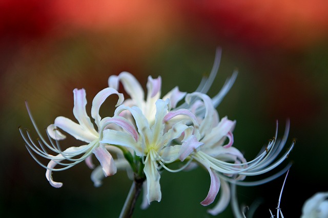 今日は仲間全員(8名)揃って民謡ボランティアでした。八名全員揃う時は、珍しいのですが、今日は始めての出し物(南京玉すだれ)口上あり、にわか口上師で緊張いたしましたが、お初にしては、玉すだれやり方と 口上方、とぴったりで 皆さんに喜んで戴きました。私は無口だから???いえね人が一口言う間に六口は喋れるんだ~い!ピンク色が混ざってる彼岸花(先日の三ツ木より)EF70-200F2,8L IS残念バックのボケは気に入っていたのですが ピン甘で乗っけてなかったのですが、写真が無くなりお出ましさせました。ごめんねこれも、バックのボケの繰り返しが面白く無いでしょうか(勝手に思い込み?)三ツ木の写真でした。明日の朝練からは又頑張るね!~~~~~~~~~~~~~~~~~~~~~~~~~~~~ 南京玉すだれ 口上(八房<やつふさ>流) 近頃 京 大阪 神戸 そして御当地で 流行り来るは 唐南蛮、オランダ南京無双の玉すだれ 玉の数は五十と六本 糸の結び目は 百と十(とう)結び 伸びたり 縮んだり 変幻自在 あらあら不思議 あら不思議 南京無双の玉すだれ 始まり 始まり・・・・・・これ何だか、好きに成りそうだわん ホント!それにしても冷え込んできましたねぇ~今夜・・・気を付けましょう