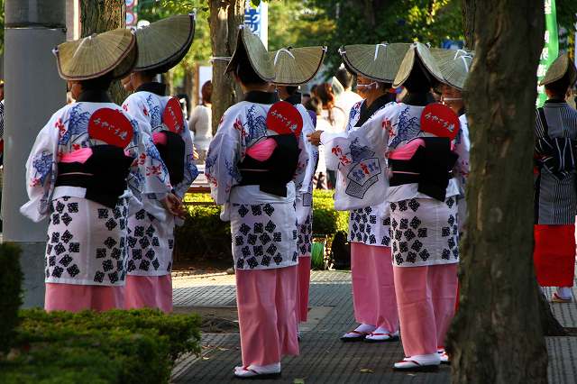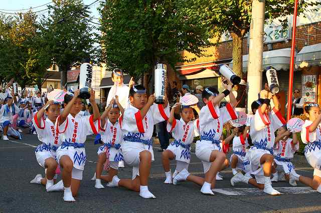 伊勢崎の祭り光りのページェント 「燈華会(とうかえ)」をブロ友さんがお友達と一緒に写しに来ると言うお話・・・私はこのお祭りは一度も行った事がありません。まだ新しいお祭りで、昔からのお祭りではありません。昨年、私の行ってた薬局の若い御主人が 「私が阿波踊りの太鼓を叩いているので見に来て下さい」と 言われたのでしたが、行けませんでした。今年は同じ群馬県でも 遠くから来てくれる人もあるのに・・・・と足でまといに成らないようにと合流を決め出かけてきました。こんな写真を撮るのも初めてです。ブロ友さんとお友達さん(写真のベテランさん)三人の合流撮影楽しかったよ!熊谷のチアリーディングの後 まずは 地元宮郷(みやごう)連の阿波踊り四国生まれの私は松山から徳島へ見に行った若い頃を思い出しました。踊りの始まりを待つ宮郷連の踊り手さん達です 綺麗ねぇ~さぁ~始まりましたよ今日(16日)伊勢崎は気温30度2分です阿波踊りにはふさわしいね ヤットサァー ヤットサー ヤットヤット この掛け声懐かしい!始まりぃ~”よしこの”のリズムも軽やかに、ヤットサー ヤットサー ジモティーの私にとっては後ろ足の跳ね上げが少ない・・・・・でもこのトップの方上手い!ちょっと一休みの時間 あでやかな踊り手さん 周りにある花模様は 伊勢崎銘仙です上の写真は、これの中央からカメラで覗いたの・・・夜になるとこれに灯が入ります周りの白いコップのようなのも灯が入るのです。(検尿用のコップで無いよははは)これはシャッターチャンスが駄目です失敗の巻き、左足が上がってるうちにとシャッターを切ったつもりが、下りてしまって居ました。(>_<)難しいねほれ!これなら色っぽいよね!ヤットサァー ヤットサァー だんだん私も踊りのリズムに乗れるようになると こんな表情を捉えることが出来ました。やっぱり見る阿呆 より 踊る阿呆がいいなぁ~♪ 阿波の殿様ぁ~蜂須賀様がぁ~今に残せし阿波踊りぃ~ ヤットヤット次は毎年徳島に出かけてるんだと思います。群馬の半プロ集団、高崎「どですけ連」の踊りを子供連よりお見せしますね。子供達もなかなかやりよるわい!薬局の若主人もこの人だろうと思うんよ お楽しみに!お楽しみに!