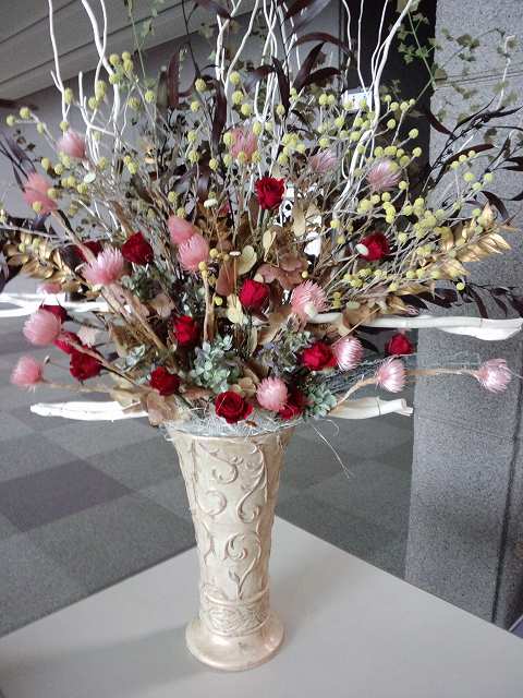 エコアートドライフラワー展こんな案内状を戴いていたので、今日境総合文化センターに友人と二人出向いてみた。私の大好きなドライフラワー展だったので本当に素敵な空間に案内していただいて、嬉しかったです。生徒さん達の作品です携帯しか持って行ってなかったので、携帯で撮らせてもらってきました。いらっしゃいませ!のテーブルに置いてありました素敵ですこのピンクはローダンセだろうか?↑薔薇は造花の様でしたが、紫陽花との色のコラボが素敵でしたこんな可愛いのも、柿の葉一枚が効いて居ますこれも中々色の取り合わせが素敵だなぁ~造花の薔薇でしたが配置が効かせて居ますクリスマスに良いなぁ~ 花瓶が布が巻いてあって、素敵なんですが黒だから・・・・ごめんねこれはすべてドライのお花だと思いますワンポイントだけど素敵よね(造花)なかなか個性的、案内状に印刷されていて、これに引かされたのでしたこれはニッキをリースに巻きつけてるようです。リボンとマッチして素敵これも素敵ですよね色あわせが何とも素敵本当に素敵な空間で何時まででも居たい感じでした偶然、本当に偶然、昔一緒に事務所で働いたSちゃんみこちゃんでしょうと声を掛けてくれた。そう言われても思い出せない、だって昔はめがね掛けていた娘だったのよだからメガネをしていないから、本当に解らなかった。わぁ~女まいが上がってるんで解らなかった、ごめんよ!上がそのSちゃんの作品です 素敵ですこれもSちゃんの作品ピンクに染めたラグラスが可愛い!このエックス、今日私が試作させてもらった、私の作品このXも造花のお花も頂いたのよそしてお試し作品作りもグルーガンで、させて頂いて、お茶にお菓子を頂き、かつての仕事仲間とも出会え本当に、至福の時間を過ごしてきました。ありがとう