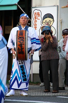 阿波踊りのバック、囃子方のご紹介踊りほど目立ちませんが、個性的な方が居ますまず大太鼓叩いてる方、イラストの「私におまかせ下さい」 が可笑しくてねぇ~あのおばあちゃんカメラマンがどけば面白いのにと狙っていたのですが、駄目でしたもう一人の大太鼓、これが薬局の方だと思いますこの方が、絞め太鼓 肩から吊るして居ます。ヤットセー ヤットセー太鼓の方の掛け合いです やっと やっと<新町橋まで いかんか こいこい>雰囲気のある、鐘のおじさん?若いんかなぁ~ 解らん?にこやかな 鐘さんです力強い男衆 の踊りこれ二階から腕組みして見ている、お爺さんが好きです良い具合に入りました ははは女衆と男衆の掛け合い、まだ男衆が弓張り提灯持ってますでしょう 次いつの間にか男衆が持っていた弓張り提灯 女の方に取られてるでしょう今度は提灯取られたばかりで無く 男衆 押されて居ます 形無しや ふふふこの写真は自分でやったぁ~と思ったのですが、回り前ボケで子供をしっかり捉えられたと、思って帰って見てがっかり・・・子供までピンボケて居ます残念イマイチ!こんなんばっかりや、もう一度挑戦するぞ!
