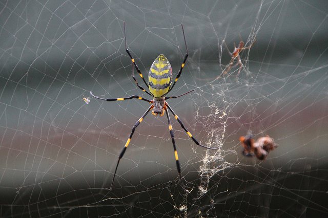 今日は写真クラブの集まりがPM7時より有りました。先日伊勢崎ー高崎間を走ったSL D6120・・・・皆頑張って来たみたいで、写真を並べていろいろ、話に花が咲いた。写真談義は楽しい、いろいろ先輩諸氏にも 教えをこう事が出来るし、フイルムで頑張ってる方もいるし・・・・(先生の来ない日は皆色々と言いたい放題)これもまた楽しい!~~~~~~~~~~~~~~~~~~~~~~~~~今日は、寝坊してしまい朝練は行けなかった。ラジオ体操のみ~~~~~~~~~~~~~~~~~~~~~~~~~~~~~~~~こんな女郎蜘蛛が我家に陣取っている右の下の方は、蜜蜂君が2匹捕まっている・・・・彼も生きていく上では仕方の無い事だが・・・名前も良くないと思うなぁ~女郎蜘蛛なんてねぇ~~~~~~~~~~~~~~~~~~~~~~~~~~~~~~~~~~~最近 大阪の歌で時々 テレビでも 宗右衛門町(そえもんちょう)ブルースが流れてる、大阪時代を思い出して、懐かしい 法善寺横町の水掛不動さんにも子供ずれで行ったなぁ~どうなってるやろ・・・又一度 難波・・・戎橋・・・御堂筋・・界隈そぞろ歩きして見たい物です。大阪すっきゃねん!