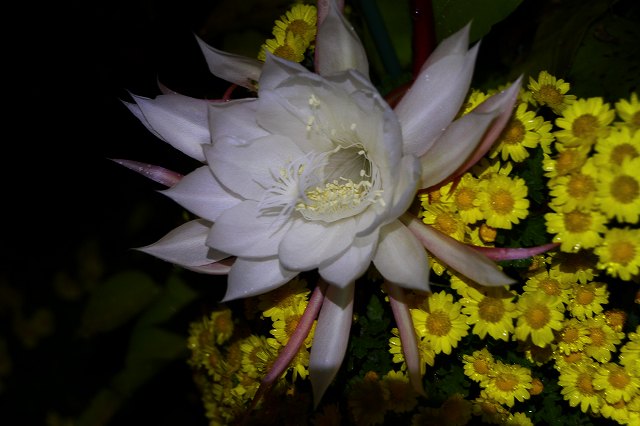 今夜今月下美人が 4輪、咲いて居ます。雨の中8輪蕾がある中4輪が今夜開花です今現在雨が止んでるので、写してきました。もう凄い香りです小菊の中に咲きました一輪目2輪、3輪め 頑張っております4輪目です(そのものズバリの色合いがでてると思います)以上4輪(全体)はライトがLEDライトです(AWB)~~~~~~~~~~~~~~~~~~~~~~~~~~~~~~~~~~ハロゲンライトで遊んでみました どちらがお好き?どうでしょうライトでこんなに変わりました面白いかもねぇ~雰囲気が変わりました(同じ2輪です)花はお外で、真っ暗の中に、良い香りで、咲いて居ます。月下美人さん 良い時間をありがとう