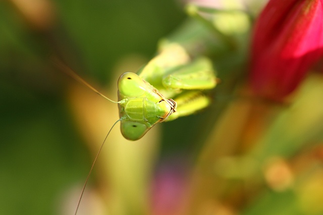 今朝の朝練は広瀬川土手を歩く・・・暫くすると、向こうから、見慣れない、背の高い若い夫婦が来る。すれ違う時、どちらからとも無く「お早うございます」と挨拶をする。とそのすれ違い座間に何ともいえない良い香りがした、男性でなくても、私、思わず後ろを付いて行きそうな、素敵な良い香りだった。多分奥様の方からだったかな?それとも・・・若い奥様は素敵な山ガールがはく様なパンツの上に短いスカートが素敵だった。そしてふと思った、私はどうだろう・・・すれ違い座間に、加齢臭でも出してなかっただろうか?あんな良い香りを残してすれ違ったら、女だって付いて行きたくなるぅ~・・・そんな気持ちの良い朝だった ふふふふ~~~~~~~~~~~~~~~~~~~~~~~~~~~~~~~~~かまきりさんの一人芝居こんちわぁ~ わてがカマキリちゃんだす 先ほどからみこちゃん家のピンクハマユウにぶら下がっているのが、見つかりました。夕日が迫ってきて居ます。変なカメラを持ち出して覗いてるんダスでは ちょっとだけよ覗かせてあげるぅ~ ♪~♪~♪ いやいや音楽はいらんのだすよ!ねぇ~可愛いでっしゃろ!優しいんだから恐がらないでね!つぶらなお目目だもんねでぇ~も カマキリ パンチ一丁出したくなっただす、アッパーかチンかそれともボディー?でも止めとこう 優しいカマキリちゃんなんだものね 美しく負けてやるんだからさ 威嚇したりして ごめんごめんね、おや? 参ったなぁ~・・・・みこちゃん良い香り!そうでしょう 朝の若夫婦の真似してね 帰ってきて、直ぐ ジバンシーのオーデコロンシュッとしたんだもの・・・・はははあんたも直ぐ感化されるんダスなぁ~参った参った!!