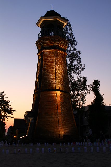 燈華会も灯が入り始めました。昨年撮りッぱぐれた鐘楼へ出かける。ネット仲間のtakaさんに御指導戴き・・・・始めての鐘楼です。なかなかのろい生徒で申し訳なかったですが 何とか・・・ね 段々暗くなってきます。「この時間は余りないよ早く!」と言われるのですがなんせ、水平はどうか?とか もっと右に寄せれば?左に寄せれば?これでいいのかなぁ~?頭の中は大変なんでやんす。でも一枚写って嬉しくなって小声で歌が出ました・・・先生に聞こえたかな?ここでこの 時報鐘楼は伊勢崎市指定の文化財です大正4年(1915)に、横浜で薬種商を営んでいた小林桂助(三光町出身)の寄付で建設され、時刻を知らせるシンボルとなったが、時報は昭和12年(1937)警察署望楼に 設置されたサイレンの吹鳴に取って替わられた。高さは14.56メートルあり、煉瓦が張壁として用いられ、ルネサンス風の窓やドーム屋根は大正ロマンを感じさせる。鉄筋コンクリート構造の建造物としては、県内最古である。まだ下の明かりは点いていませんが・・・・鐘楼はライトが点きましたね、ね、右側の木、女の子がひざまずいて、お祈りしてるように見えない?これが入ったこと、気に入ってるんですが?どうでしょう??方向を変えてちょっとした土が盛ってある小高い場所に移動・・・三脚が安定しないのです水平が取れないのです・・・・で早く撮れないのよ何とか下の明かりが むこうから一個二個と点き始める・・・・この空が青く写る時間は少しの間きりなんですって・・・・気ばかり焦って・・・この程度ですが・・・合格でしょうか?アングル????左の明かりはカットですねぇ~反省此方からも灯りが点き始める・・・・こんな空の鐘楼は撮った事なかったので嬉しいです。段々と下の明かりと共に空は暗くなって来ました。伊勢崎の古い由緒ある鐘楼です。この場所左(銘仙の館)もう真っ暗になってきました。お月様も出てきました。(右下のライト邪魔だったなぁ~あとで気が付く)ドジな生徒で本当にお世話掛けました。サンキュ