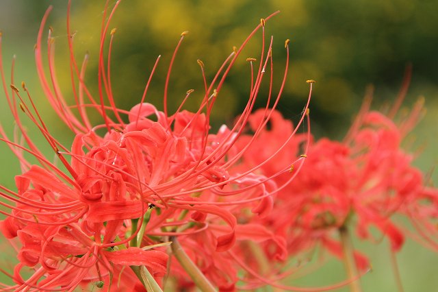 直ぐ近くの畔に彼岸花が咲いた。2メートル位置いてユリオプスデージーの黄色が咲いている。上手くバックのボケに入れて撮ってみるかな!一号作品(白っぽいかな?)2号作品(補正マイナスをもう一段もう一段)逆ボケにもしてみたいろいろな表情を見せてくれるアリさんもウロウロしている御近所のススキ・・・桑の葉っぱの間から覗いてみた!どう面白いねぇ~最後に雨が降ってきたのよ(人工の)ははは泣かずに遊びました。お終い サンキュ