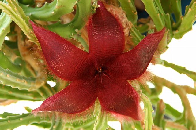 今年は暑かったので、今頃犀角の花が咲きました。和歌山→大阪→群馬と連れ歩いてる唯一の犀角(さいかく)です。毎年ご紹介して居ますが、ギンバエが寄ってくるような臭いを発します。良い香りだとお勧めなんだけど、今イチね・・どんな臭い?あんな臭いです・・・・ハイ!今4個も咲いてるので、網戸の所に、蝿が何匹かよってきて居ます。ホントよ臭い犀角(サイカク)ですびっくりしないでね、みこちゃん「ごめんやしておくれやす」とでもいってるのかなぁ~pinkのハマユウにカマキリさんです。何処かに卵産みたいのかなぁ~お腹大きいみたいです。このpinkちゃん今花芯6本が競って居ます。花芯一本に16輪位次々ラッパが出ます豪華な花です。長く楽しめますよ!