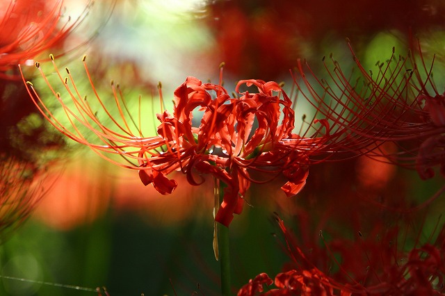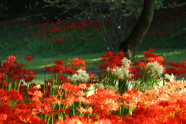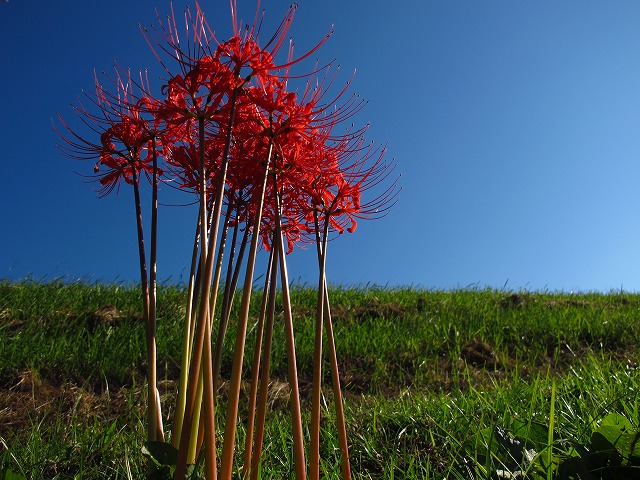 御嶽山のヒガンバナを見に行った。凄い事に成ってる、良い場所だこんなのどう?うるさ過ぎますか?颯爽とすくっと立ったヒガンバナ凛としてる赤のバックに赤のヒガンバナを浮かせてみた、残念なのは左の枯葉が気に掛かる紅白に入日を写して・・・何という色・・・気に入ってます向こう側にも光がが入って来ましたこうなると夕日との追いかけっこです横に撮った時は向こうに光がほんの少しに成っています。ほんの一瞬です此方も撮って見たい・・・場所を変えて撮って見るこの×の木が入れて見たくて・・・・どうですか?上手く重なり合って面白いと思いましたが?続きは又あすねもう感動の連続だったよ!