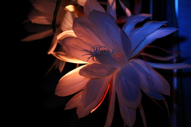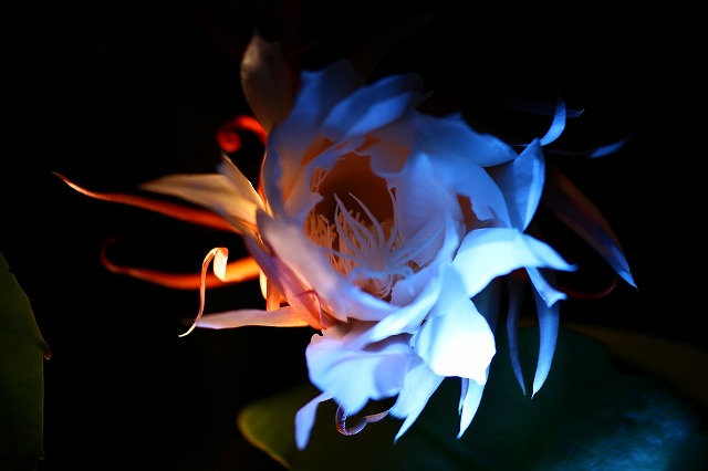 昨夜月下美人が一輪咲きましたがお昼過ぎから、ネット仲間のトドさんが、今度はブルーとかグリーンの光も良いかなぁ~とか言っていたので。それでは早速 ご要望にお応えすべく昼間ヤマダ電機とかセキチューとか色々歩き考えましたが結局、100円館の透明フイルムの折り紙を懐中電灯にかぶせる事にして用意しました。夕方花を見に行って見ると・・・少し今夜は遅い気味に咲くな・・・そう思って夜中まで待つことに・・・此処までは良かったのですが・・・その後がいけません!寝てしまったのです。ホント起きたのがAM3時30分慌てて行って見ましたが、お花は終い気味であの素晴らしい香りがもうありません。本当にがっかり サザエな私を自分が恨みました ははは~~~~~~~~~~~~~~~~~~~~~~~~~~~~~~~~~~~~それならと、終い気味の花を撮って見ました。用意した光でねしぼみかけてる AM3:30の月下美人それなら やっと雌しべが見えてるので雌しべでもUPしてみようの発想です色々な光でねほらほら トドさん ダイオウイカ だよ!こちらの方が ダイオウイカ らしいかな? 雌しべだよぉ~ん!こんな色もご用意しました ははは もう萎(しぼ)みます。先がこれ位しか開いてないのです。お花を無理に引き開けましたが、無駄でした我が家に住んでる殿様ガエルが言いました。昼間あんなに応援してやったのに寝るとは何事だ!呆れてしまうやつだ 要するにあほやなぁ~花を引き開けた?そんなことしたって終わりは終わりやがな・・・・~~~~~~~~~~~~~~~~~~~~~~~~~~~~~~~~~~今度はうれしい事、一センチ位の月下美人の蕾今度は7個ついてますねん咲くやろか?・・・・こんどはねぇ~かすかな希望を残して・・・・