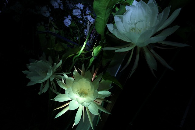 余りライティングが良くなく上手く写っていませんが三輪が咲いています。今夜は又5輪咲くと思いますヘッドランプの赤です、下からハロゲン光を少し風が強くてねぇ~撮影には余り向かない夜ですシャッター優先に切り替えて撮っています光によっていろいろ違った顔を見せてくれます風が強く、寒くなってきました。もう止めよう2輪は一枚の葉っぱの両側から出てるの一緒に撮れます下の方に一輪ぼぅ~と見えていますが・・・仲良し3輪ですが下の一輪はまだ開き切ってないようです。お粗末様でした今夜も5輪撮って見ますが・・・・ライト助手が欲しいねぇ~