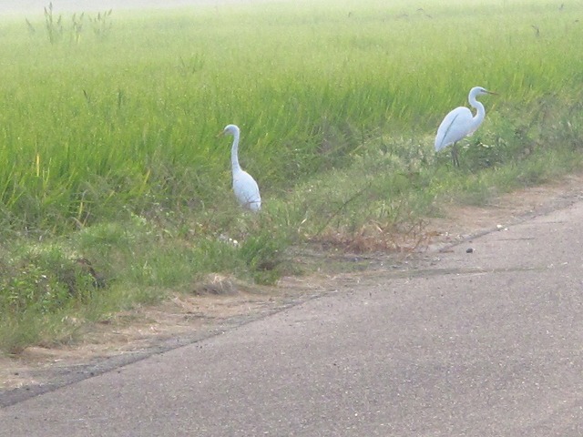 田んぼの中をお散歩…いやいや仲良しご夫婦の鷺ちゃんがいます。 ここらあたりは植え付けが遅かったので実りまでは、まだまだですがミミズでも朝ごはんを調達してるのでしょう6時位だったのでまだ朝霧です飛び立たない範囲で近づき誰か通ってくれるのを待っていました。シャッタースピードも飛んでもゲットできるスピードにして待つ事一分、予定どうりと言おうか自転車のお兄さんが通ってくれました道路際だから、彼達ご夫婦は飛び立ちます。2頭を負うものは一頭も得ずを頭に入れて、一匹に狙いを定め待っていました・・・・chance!こちら彼だと思います!コンデジG12と云えども此処まで!(これトリミングしてま~す)狙いどうりゲットお兄さんありがとう、わぁ~い大声を出したいくらいうれしかったが、抑えて抑えて・・・ね悠悠もワンワン言わないでありがとうさん でかいカメラだと良く撮れたのに残念!でもこんなに計算どうり行くと\(^o^)/です別に特別いい写真でもないけどchanceが嬉しくて!何だかルンルン気分だよ~んそれから広瀬川の方に足を延ばす。悠悠 「お母さんさっきはうまくいきましたねぇ~」曼珠沙華ももう最後かな?白い雲が多くて太陽がはっきり入りません雨が来そうだから仕方ないですね。