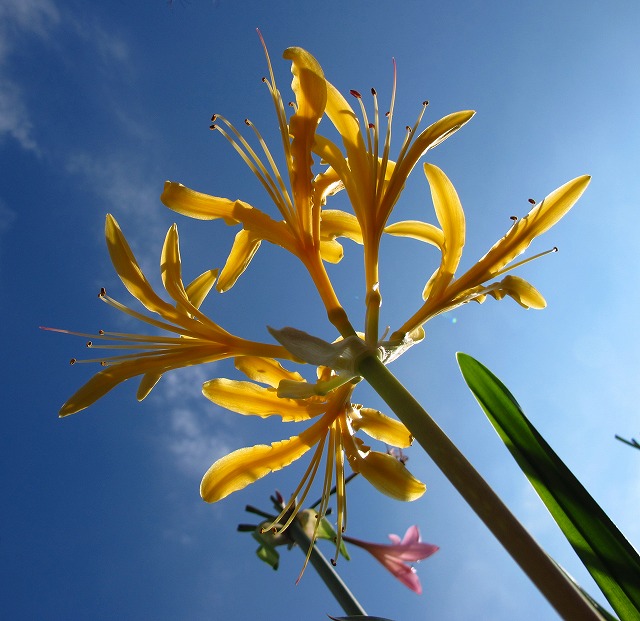 まだ日中はなかなかのものです、暑いです。昨日の黄色の リコリス「オーレア」これは7年も前でしょうか福島の滝桜を見に行った時花見山の所で売っていたものを買って来たのですが、消えてしまったのかと、思っていましたら一昨年頃から、一本、二本、と花芯を出し始めました。今年も一本目・・・これっきりかもしれません、なかなか増えません良く見るともう一個蕾があるようですね明日は咲き切りますねぇ~みこちゃん、此処でちょっと休ませてなんて野良ちゃんにウインクされちゃったこの子はもともと野良だった訳ではありません。ご近所のおじいちゃん(95歳)が可愛がっていました。そのおじいちゃんが、お世話できなくなり、こうして、ご近所を拝借して、子育てをしたりしてるのです。だから、人懐っこいのです。我が家にはワンが居るので少し遠慮気味に来てるようですが・・・・可愛そうですが決してエサは上げないことにしています。居る分には怒らないことにして悠悠に知らせるのよ悠悠~にゃんが来てるよ~するとすぐ悠悠がわんわん言うものだから、逃げて行ってます。~~~~~~~~~~~~~~~~~~~~~~~~~~~~~~~~今日は元気の出るお電話もあり、ありがたいものです。涼しくもなり、大分やる気が出て来ています。此処んとこ写真展の案内が多いので、お勉強方々、出かけてみようと思っています。