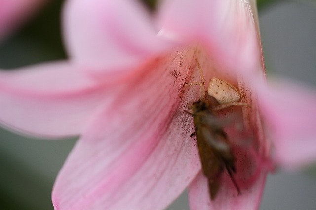 まぁ~見て下さいチョット写真がぼけていますが、あの白い蜘蛛がイチモンジセセリ蝶を捕まえて体液を吸ってるんです暴れたのでしょうイチモンジの羽根の粉が、アマクリナム・ドロシーハンニバルの花のラッパの中に一杯最初、花の中が何で黒くなってるのかなと、覗いたのです・・・そしたらどうでしょうラッパの中に潜んでいた蜘蛛が、花の蜜を頂きに来たセセリ蝶を捉えたのですこれこそ生きるための戦いです。どちらを責めるわけにも行きません。生きるための戦いですからねぇ~蜘蛛の勝ちぃ~でしょうか?凄い処見てしまいました。もう一つ上を見てると、ヒラヒラと華やかに黄アゲハが後ろの花にやってきましたマクロを付けたままでしたが・・・ゲット・・・・此処までは良かったのですが羽根にご注目これで良く飛んでるねぇ~何と生きる戦いをやって来たのか、彼?彼女?羽根ボロボロですね・・・哀れでしょう・・・でもアゲハの事、華やかに飛んでいましたが・・・凄い戦いだったのでしょうね、何者に引き千切られたのでしょう・・・それでも頑張ってるんだ!我が家の花で良いならゆっくりお休み!これこそ「命」の題にぴったしだなぁ~そう思う少しバテテる私にこの姿見せたかったのかなぁ~2度やってきました。同じ子だとこの羽根ではすぐに解ります。泣けたよ!ありがとう