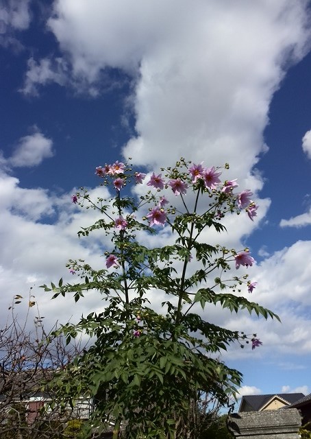 今日は民謡ボランティアの日、午前中頑張って来ました。久しぶり、本当に沢山の方達が迎えてくれました帰りに青空に向かって本当に綺麗に咲いてる通りすがりの皇帝ダリヤを、車を止めてスマホにて写してきました。まぁ~まぁ~高く高く堂々と・・・ね! さっき、おしゃべり、流調でなかった 事などすっかり忘れさせてくれる皇帝ダリヤですやっぱり おしゃべりが 滑らかに滑らなかったのよ モタモタとして・・・・反省明後日の分は、バッチリやるぞ!「河内音頭」歌の方はバッチリ行ったのですが、おしゃべりの方がね皆がどっと笑ってくれるような流ちょうな、喋りが出来なかったなぁ~一応頭の中である程度、練って行かないと駄目ねぇ~何とかなるさではダメですね今まではおしゃべりは出たとこ勝負で決めていたのですが・・・頭が錆びついて来たようです。