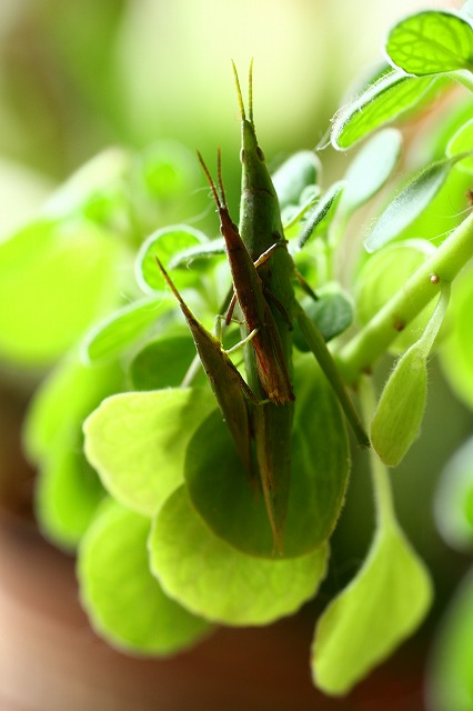 おんぶバッタが雄2匹雌一匹???どうして??解らないなぁ~飛びついてる植物はハーブのアロマティカス、花は咲きませんが挿し芽でどんどん増えていきます触ると良い香り?好きずきかな?3匹です珍しいですね3匹で絨毯に乗って飛んでいく様でしょう可笑しいなぁ~多少2番目の雄がモゾモゾしています。触角を前後に振っていますこの格好・・・面白いでしょう手を前に回して・・・・漫画の世界みたいでしょう楽しませてくれました。モデルに成ってくれたので優しく田んぼの方に放しておきました。そのままにしておくと明日にはアロマティカスと言えどもかじられてしまいます・・・・ご苦労さん!