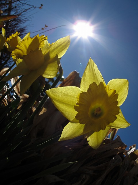 黄水仙が陽だまりでどんどん咲いてきました。今日の状況陽だまりで・・・太陽を入れて見た4輪行儀よく並んで咲いています下から・・・上から4輪・・・こんなにくっつかなくても良いものを今日は白鳥さん良かったかもね・・・・気になるが・・・・やっと外で咲いた花なので嬉しくてしつこくごめんね!