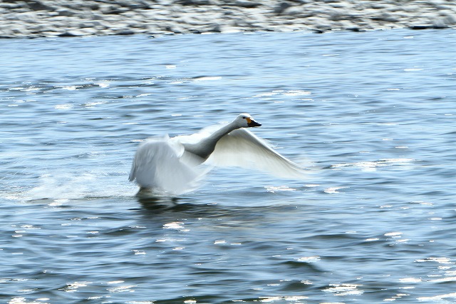 岩倉橋の白鳥さんを見て来ました。黒鳥が一羽いましたチョットスローで生意気に・・・・撮って見ました目のピントを外さないように気を付けて・・・羽根がフワ~として良いかな?まだ140羽位居ます。30羽位はもう飛んじゃったとか・・・・水の上をスケートしてるように、速度を上げ始めました・・・飛ぶよ・・・なのになのに・・・・僕や~めたと着水今度は4羽同時よ飛べ~飛んだぞ・・・・・と嬉しがったのですがなんだもう着水・・・食パン目当てでしたどいて どいて 僕の降りる所開けてねぇ~・・・・・と飛んで来ました。午前11時頃から、白鳥さんの食パンは持って行ったのですが、自分はお昼なしのず~と4時間、川べりで白鳥見ていました。あんたも好きよねぇ~と言われそうですが、お腹すいたぁ~そうだ4時には歯医者の予約が入っていたのです。良く思い出しました慌てて3時過ぎ家にと帰って来ました。いや癒されますよ白鳥さんは、ロマンもあるし・・・そろそろ北帰行も近づいて来ますしねあまり良い写真はないですが見て下さい。