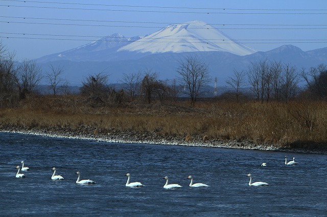 昨日の周りはこんな感じだったのですよ浅間山が綺麗でしょう、ちょっと電線が残念なんですがご勘弁くださいませ!ハーイ皆さん私に着いて来て!とでもいうように川上に泳いで行ってます何だか騒がしくなってますね。食いしん坊の彼、彼女たち、橋の上から、食パンでも投げてもらったのかな?直ぐ上に岩倉橋があるのです右の下の方の影は橋桁の陰でしょう私は川と橋の間から浅間山を、切り取ってるんです。カメラを少し引くと橋が入ってしまいます。 ははは群馬県佐波郡玉村町の烏川河川敷より昨日は一羽来ていました。黒鳥は目も赤いのですねブラックスワン君は草食だそうです、白鳥さんの様に 渡りはしないで、ウロウロ漂ってる漂鳥だそうであります。日和見な彼らなのですね。知りませんでした。羽根を広げると白い羽がV線に成りますが・・・なかなか広げてくれません河川敷の主みたいな爺ちゃんに、得意げに見せてもらいました。羽根を広げると白い羽がV字に成って綺麗です。白鳥さんはよく嬉しげに羽根を広げてくれるんですが・・・・私を見て・・・とでも?食パンを食べた後は盛んにこれをやってくれるんです。やっぱり嬉しい時なんかなぁ~ブラックスワンは、渡りは しないと聞き少し白鳥さんの方がレベル高いねぇ~ちょっと夢が壊れました。白鳥さんの価値がぐんと上がりましたわ!