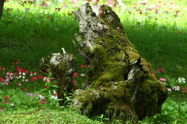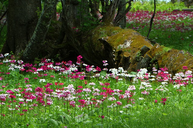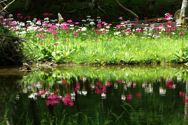 本当に素敵な場所でしたが、いかんせん腕が追いついていかん!です滝でなくても、ハーフNDやND欲しいなと思いました。そして楽して、自由雲台の一脚にした事(軽いからと)もやっぱり反省ですちゃんと三脚を持って行けば(一脚だと限度がある)・・・・と反省・・・と言うのは、光の当たってる所と、影の所が極端にあり苦労です。水辺の くりん草 この根曲がりの木が面白いので入れて見ましたもう風が・・・水面を揺らしますチョット大蛇が大口を開けて、お花を狙ってこちらに・・・(笑)見える?水辺の倒木と川向こうの映り込みと手前の クリン草とクリン(九輪) とは五重塔の上から天に向かって突き出た部分を言いますが花の付き方があの五重塔の九輪に似てる事からクリン草と名づけられたらしいです。近寄ると花の付き方が良く解るかなぁ~似たような写真ばかりごめんね明日はクマちゃんが登場よ!ふふふ