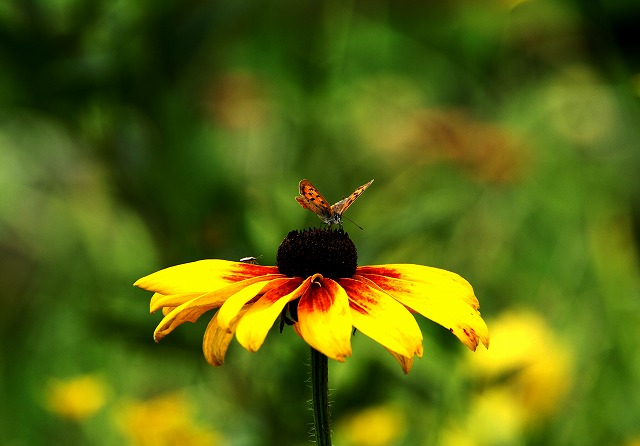 今日は蝶やその他道路にお座りして根競べです。変なおばさんやねぇ~車で側を通って行く人がけげんそうな顔をして見て通っています・・・(笑)何も他の事を考えないで良い この時が私には一番いい時何だから・・・まぁ~良いか!紅シジミがやって来ました友達の畑です ルドベキアの花に!モンシロチョウがやって来ました、モンシロチョウは案外止まらず行ってしまうのですがチャンス! 蜜を吸い始めました。早く!紅シジミもウロウロし始めました・・・・ツマグロヒョウモンの雌もやって来ました。残りの白のセキチクの花の蜜を吸ってるようです今日は曇ってるので・・・・外で居てもまぁ~まぁ~バックが汚いねぇ~頑張って蜜を吸っています。足長蜂などもやって来てびっくりしたり・・・大きなダリヤも・・・バックのボケは松明草のピンクです。毎年良く咲きますこんな子も居ますこれは我が家、これ5ミリもない位のチビ オンブバッタですガザニヤの花弁の上に・・・・見~付けた!ブルー色の シジミチョウが来たよ一日中梅雨空のうっとうしい感じの一日でした。