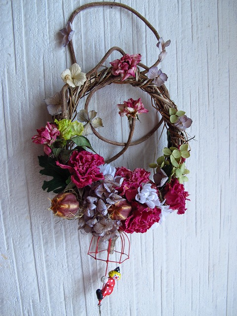 今日は案外冷えました。長袖に着替えて重ね着・・・・作品を今日は作って見ました、先日乾かしておいた、薔薇が乾き・・・我が家を悩ます、ヘクソカズラを利用してリース台を作り・・・今日は作品にしてみました。まぁ~何時から作ってなかったのでしょう・・・作り始めると燃えますねぇ~楽しいです・・・・でこんなん出来ました~紫陽花は昨年の物です、一年たっていますが、良い感じに色が残っています下のピエロは壊れちゃったの捨てきれなくて下にくっつけて見ましたニゲラも昨年の物です、今のはまだ花畑にあります・・・・そろそろ干そうかなと思っています。こんな事してる時間は私の珠玉の一時です。お花は全て自分で育てたものですが白2輪だけアクセントに造花です~~~~~~~~~~~~~~~~明日は又暑くなるようですね、体が追いつけないですよねぇ~