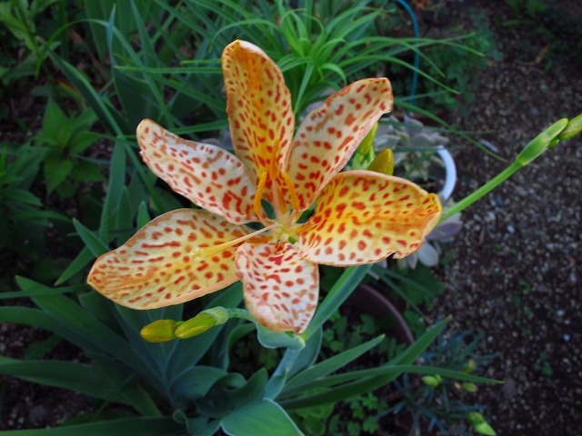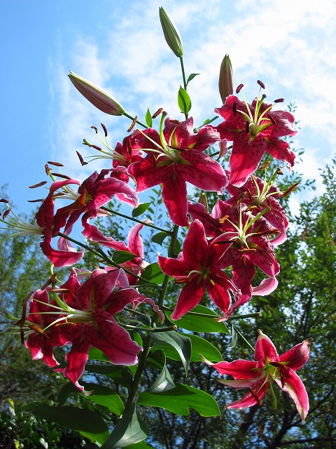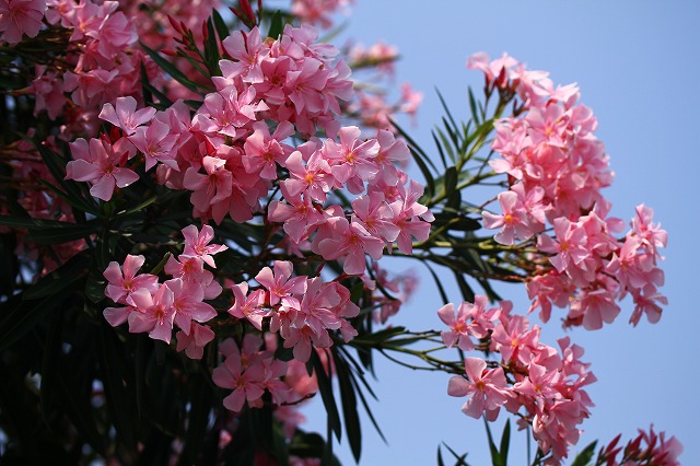 昨日ちょっとホッとさせてくれましたが・・・又今日はなんと暑い事か・・・・まだこれから本格的と言うのに、体が持つのだろうか?庭の花達もボツボツですこのグロテスクなのが咲きはじめです 檜扇でしたっけ?これは又繁殖力が強く 抜いても抜いても出てきます。でもお花が咲くとこの涼しげな色に癒されます都忘れ の花かな?今日の暑い空に、ご近所さんの夾竹桃の花です、この木には毒があります。でも爽やかなピンクですね。高い 高い 大きな木に成っています。ノウゼンカズラ、夾竹桃、等が咲きはじめると夏も本番でしょうか?耐えるしかありません。