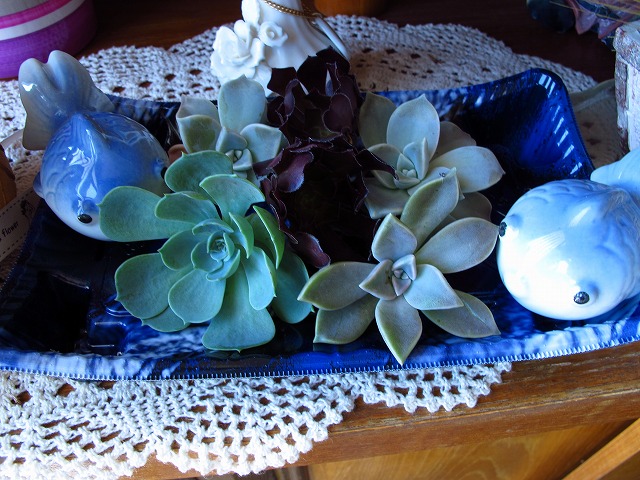 酷暑の毎日ですちょっとお腹を壊したりしまして・・・ブログが滞りましたすみません!こんなことをしてみました。七福神とおぼろ月、それからあの黒い多肉を積んで転がしています根っこが出てくるまで・・・ヒカゲジャノメかなぁ~我が家のセージで一休みこれ今ドライにしてるアジサイ(これピンクだったのよ)ですグリーンは白の西洋アジサイ(アナベル)私も好きねぇ~って感じです!これはまだ材料を寄せてみただけです アジサイとニゲラの種ですまたリースにでもするかね・・・楽しみ!今年は雨が多かったのでアジサイのお花は腐ってしまった花が多かったです。これは黄バラの造花を使っています、上にちょこんと乗っかってるのはアジサイ!これは昔沖縄ガラスに夢中だったころに買ったものです、あまり暑いので沖縄ブルーを出してみました!それにしても暑いですねぇ~