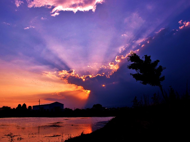 今日のひまわりの様子、娘が東京で何処かサービスでもらって来たから咲かせて!何て送って来た袋を開けて見ると5粒位入っていましたが、殆ど割れている種でした蒔いてみると、2本芽が出たのですが、やはり割れたのは駄目ですねぇ~一本は枯れてしまいこの一本だけ、移植が出来ました。やっと咲きますでっかいひまわりです今1メートル60位あるかな?お花は中央の種の所だけで今15センチはあります開き始めていますので明日は花弁が全部開くでしょうか?今日は寒かったので此処まで~~~~~~~~~~~~~~~~~~~~~~~~~後は今日の夕焼けです水田に写った太陽に感動の連続よ!横で撮ったのもあるのですがやっぱり縦撮りが良いかな?横に撮るとやっぱりあの鉄塔がいっぱい映り込むんです・・・できればない方が良いのですが自転車で走って行けて鉄塔がない処などないのです~此方が光芒が3本立って水田に映り込んでいます上のより太陽が下に降りてるのですね慌てて自転車で、近くの豊受橋迄自転車で走ったので、もう息が上がってぜーぜー言ってました少しトリミングしてもこうなるんですよ夕日が落ちてからの水田です綺麗でしょうカメラがね急いで小さいの持って走りましたからCANON G1Xなんですやはり頑張って7D持って行けばよかったねぇ~今頃後悔しています。