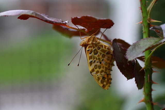 うんうんまだ眠っています。昨夜のままですが赤い処はありませんねまだ起きないのぉ~(じっと待つ!)AM6時35分に行って見るあれ~薔薇の葉っぱの上に乗って羽根を広げている・・・朝日が柔らかく照らしています「おはよぅ~」これから飛んで行くために夜に冷えた羽根を温めてるのです30分位温めていました。この間は羽根は動かさないで広げたままみこちゃん早く写しなさい!とでも言ってる様よ「チャンス!」パチパチの連続 う~れしいな!嬉しいな!ありがとう宿泊のお礼かなぁ~ ワクワクする!薄ブルーの朝ですじっくり、羽根を温めてから飛んで行くのですねぇ~賢いツマグロヒョウモン雄ですまだ大丈夫かなとアングルを変えて撮ったこの後、みこちゃんありがとうとでも言ったか言わなかったか?飛んで行ってしまいました!傷のない若い雄のツマグロヒョウモン蝶でした。凄いドラマを見せてもらいましたこの間45分位だったかなぁ~これは下からも撮ってるんですがおまけの写真ですわくわくのドラマでした
