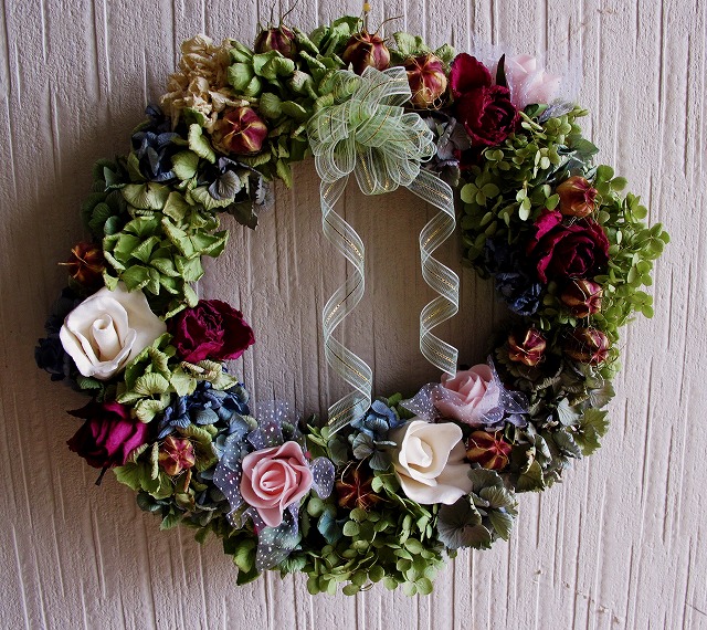 自分でお花(紫陽花)を乾かしてリースを作っていますこんなのを作って見ました貝細工、紫陽花、瑠璃玉アザミ、ハーブラベンダー、ミニバラ等ですこれもリボンを混ぜて、貝細工 紫陽花 ミニ薔薇 ニゲラの策お友達などにもあげたり、毎晩 一個位づつ作っています。この紫陽花が乾いたこの時期がチャンスです貝細工は友達の畑より頂いたりして来ています。