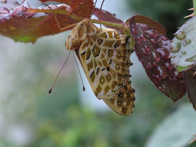 今夜の一夜の宿をみこちゃん家にお願い・・・・と5時頃小糠雨の中、ツマグロヒョウモンが白いムクゲの花にやって来ましたが、見てるとお隣の薔薇の葉っぱの下の方が良かったのか止まり替えて・・・この状態です。先程9時50分頃見に行きましたが今夜は我が家どまりと決めたようですこれが5時半頃これはライトをたいて見た・・・これはライトを止めてISOを上げて見たこれはもう7時過ぎかなぁ~これでもう眠っているのかなぁ~これは9時頃かなぁ~羽根に赤い処が見えているライトをバリバリ焚いても平気な様子・・・もう寝てるのでしょうか?あの赤はリラックスすると出るのか?可愛いやつですよねぇ~我が家の薔薇の葉っぱにぶら下がって眠っています?いやライトをバリバリ焚いたから興奮して赤くなってるのかなぁ~今見に行きましたが10時過ぎても我が家の薔薇の葉っぱの下動いていません朝はどれくらいの時間に起きるのだろう?興味深々です
