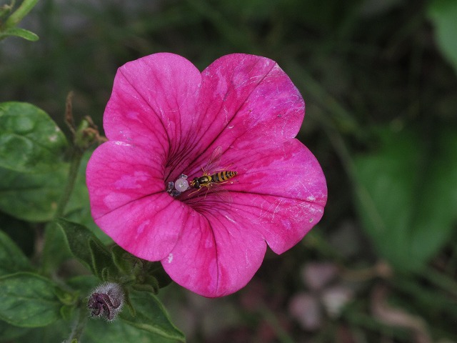 ハナアブさんが サフィニアにやって来ています 可愛いですね