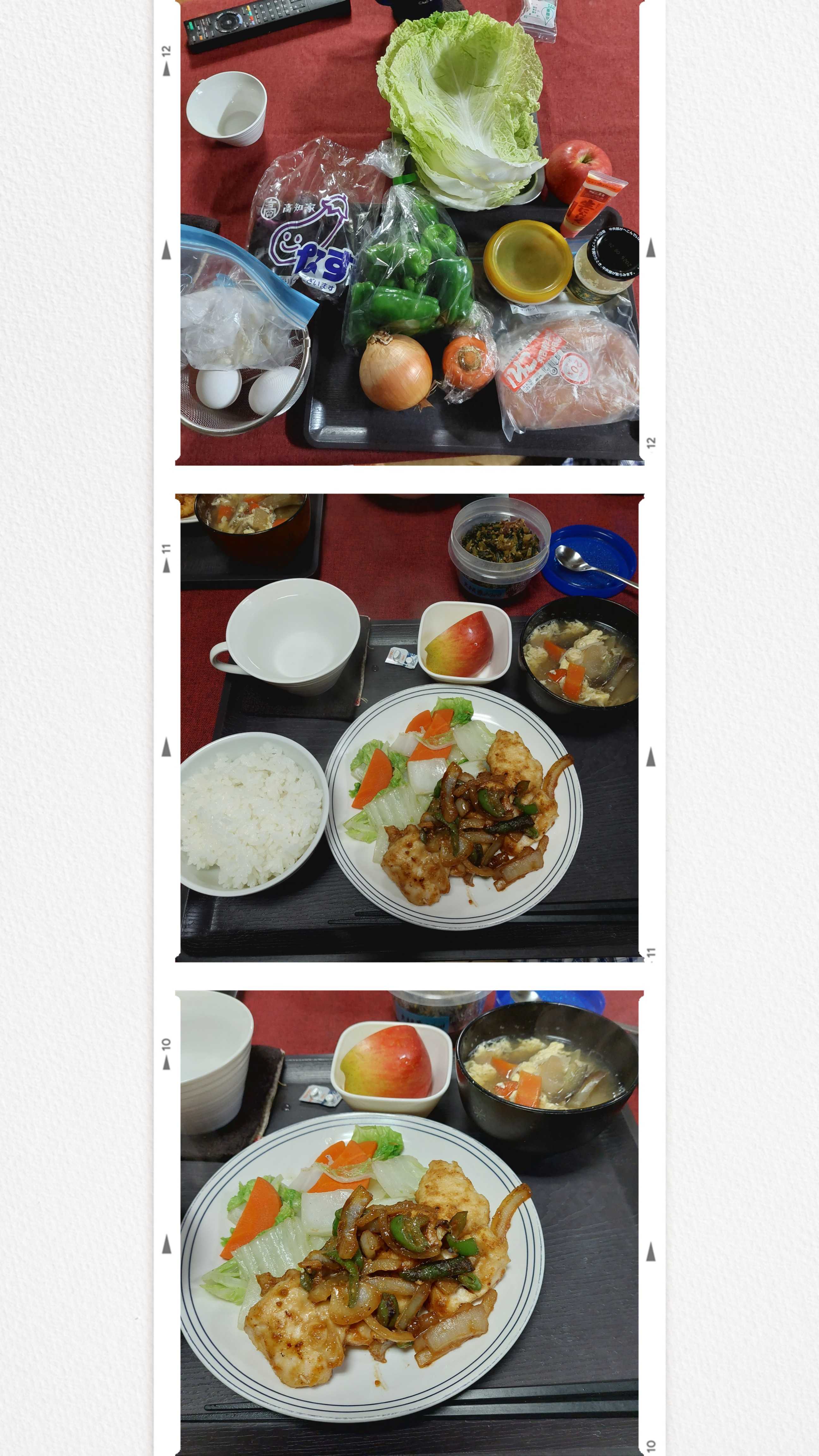 ●夕食は、、、鶏肉味噌だれ焼き、炒め野菜、りんご、かきたま汁、大根の葉のふりかけ