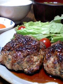 焼鳥屋さんのつくね。あれは旨~!!どうにか作れないかな?と。何度も挑戦しましたが、なかなかうまくいかなくて…。本日ひらめいて、作ってみました。かなりうまく出来たみたい。材料・豚挽肉 ほぼ400g・鶏挽肉 ほぼ200g・大葉 10枚・パセリ 3本分の葉っぱ・生姜 半片・塩 適量・醤油 適量・日本酒 適量タレ・砂糖 小さじ1と1/2・みりん 大さじ3・醤油 大さじ3・オイスターソース 小さじ1と1/2・卵黄 ひとり1個(欲しかったら2個)作り方1:大葉とパセリを細かく刻む。生姜はすりおろす。2:ボウルに挽肉2種類と、1と調味料を入れて、 よく混ぜる。3:フライパンを温めて、2を入れてフタをして焼く。4:片面が焼けたら、ホイルの上に取り出して、 焼けていない面を上にして、 黒胡椒をかけて、グリルで焼く。5:焼いている間に、3のフライパンにタレの材料を入れて、 少しに詰めてタレを作る。6:上の面にこんがりと焼き色がついたら、 取り出して、お皿にのせて5のタレをかける。7:小皿に卵黄を1個分いれて、添える。つけあわせには、生野菜をどうぞ。今日は、サニーレタスとプチトマトでした。新タマネギもよさそう。混ぜ込んだパセリが、自己主張せずにお肉の臭みを抑えてくれて、なかなかいい感じ。これから、こういう使い方もアリかな。大葉との相性もバッチリでした。タレも、オイスターソースを入れたら、コクが出ました。それだけ味見したら、お魚のあら煮みたいな味~。これでご飯いけちゃうかも♪でした。本日も成功してよかったよかった。ごちそうさまでした~♪オマケゴーヤのオカカマヨ炒めゴーヤとタマネギは3ミリくらいの厚さに切る。フライパンにマヨ(適量)を入れて、薄切りニンニクを炒める。香りが出たら、ゴーヤを入れて炒めて、後からタマネギを入れて、透き通るまで炒めたら、オカカ10gを入れてよくからめて、お醤油(適量)を入れて、火を止める。できあがり~♪ビールの友です。