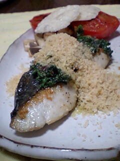今日は手の込んだ(?)お魚料理です。たまには、こういうのも作るんだからね~!いばってどうする?あれこれ手間かけましたわ~。付け合わせトマトとハタケシメジのソテー(オリーブオイル、塩)パルメザンチーズのパリパリ(切ってレンジで加熱しただけ)ソースバターを熱して、パセリ(3本くらいの葉っぱをみじん切り)とアンチョビ(3切、小さく切っておく)を炒め、火を止めてから、オリーブオイルをたっぷり入れました。パン粉もバターでこんがり炒めておきます。材料と作り方鰆に塩胡椒して、小麦粉を薄くつけて、サラダ油できつね色に焼きます。お皿に、トマト、ハタケシメジ、パルメザンチーズを盛りつけて、横に鰆をのせて、上からソースをかけ、その上からパン粉をのせます。かなりおいしいです。ホント。やっぱり専業主婦に戻る??そう言わしめたお味でございました。今夜もごちそうさまでした。