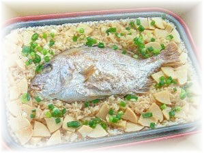 鯛めし@BRUNOコンパクトホットプレートで娘のお婿さんと共に、出産&退院のお祝い。こちら↓の動画&レシピを参考に。今回、ちょっと小ぶりだけれど鮮魚ではなくて焼いた鯛が手に入ったので、一手間省けました。簡単でプチゴージャスな出来上がりに満足●材料(2合分)〈だし汁〉水 400gほんだし 大1(9g)醤油 大2(36g)酒 大2(30g)みりん 大1(18g)〈具材〉お米 2合(300g)小ぶりの鯛 1尾ゆでタケノコ 約60g位小ねぎ 適量●作り方(鯛に塩をふって15~30分置き、出てきた水をキッチンペーパーで拭く。 高温に熱したホットプレートにホイルを敷き、鯛をのせる。 片面5分ずつ焼いて両面に焼き色をつけ、一旦取り出す。)←今回省略洗ってざるに上げた米をプレートに平らに広げる。だし汁を加え、鯛を乗せて周りにスライスしたタケノコを散らす。高温で加熱後沸騰したら2分待ち、蓋をして中火(140℃)15分加熱。スイッチを切って蓋をしたまま15分蒸らし、小ねぎを散らす。鯛を取り出して身をほぐす。ほぐした身をホットプレートに戻し、全体を混ぜる。