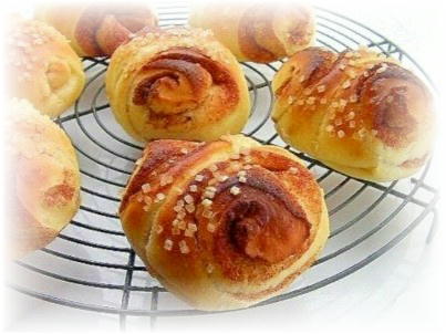 シナモンと合わせる砂糖をラカントに替えて糖質&カロリーをダウンし、映画「かもめ食堂」の成形で。よく膨らんで、シャープな姿ではなくふくよか生地に入っているカルダモンのおかげで、ちょっと大人味の「シナモンロール」に?●材料(7個分)〈パン生地@HB〉強力粉 160g薄力粉 40g砂糖 20gバター 20g塩 4gカルダモン 小1/4(小1/2)卵黄1個分+牛乳で 154gドライイースト 2g〈シナモンシュガー〉シナモンパウダー 4gラカント 20g〈接着用〉卵白 適量〈トッピング〉卵白+クリスタルシュガー 小1/4(約1g)×7●作り方生地をめん棒で縦20cm×横35cmの長方形に伸ばす。卵白を塗り、シナモンシュガーを振りまく。長い辺から、ぎゅっと巻く。台形になるように、端から斜めに切る。短い辺を上に向け、両手の小指で押さえる。仕上発酵後、残った卵白を塗り、クリスタルシュガーをのせる。オーブンで200℃約12分焼く。