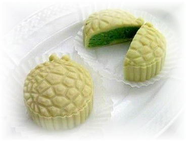ライチの月餅型って、メロンにも見える?なので、ミルメークdeメロン米月餅の生地で青きな粉ベースの餡を包んでみました。果肉に見立てた餡の色の方が濃くなってしまい、違和感は否めませんが、目を瞑ればメロン味♪●材料(1個分)〈生地(23g)〉煎り米粉 10gミルメークメロン 1袋(6g)牛乳 6gサラダオイル 1g〈餡(24g)〉青きな粉 10g牛乳 8g砂糖 6g塩 少々