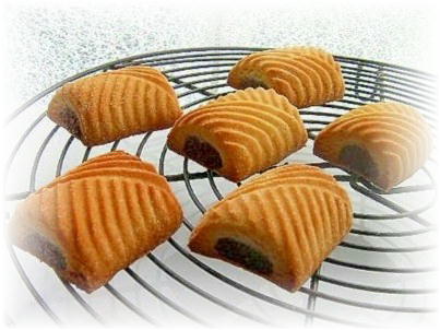 セモリナ粉、蜂蜜&デーツのクッキーである北アフリカの「マクルート」を手に入る材料で。本来オイルで揚げる工程をオーブンでの焼成に替える、デーツフィリングを多めにし、シロップは控えめにする等自分好みに♪前回の失敗は、イングリッシュマフィンでコーンミール代わりになるぐらい大粒の「S-1 デュラム (セモーレ) 粗挽」を使用したのが敗因と思われます。というのも、粒子が粗いと油と接する表面積が小さくなるため油を吸収しにくく、その結果生地が緩いままになってしまったのでしょう。なので、デュラム小麦粉(雪和)でリベンジ!オイル投入後パラパラ状態になり、よい感じ予定していた水量も余すことなく加えられました。 周りはカリッと、中はしっとりの仕上がり。ゴマの香ばしさ&プチプチ食感がよいアクセントに、オレンジとスパイスの香りも魅力的♪ちなみに月餅型で作ったものがこちら薄力粉やオレンジピールを加えたり、フィリングの割合を多めにしたり等でマームール同様、「なんちゃって」の域を出ないので「マクルート」風に甘んじていますが。いつか実食の機会を得て、本物に近づけるといいな。詳細を楽天レシピで見る