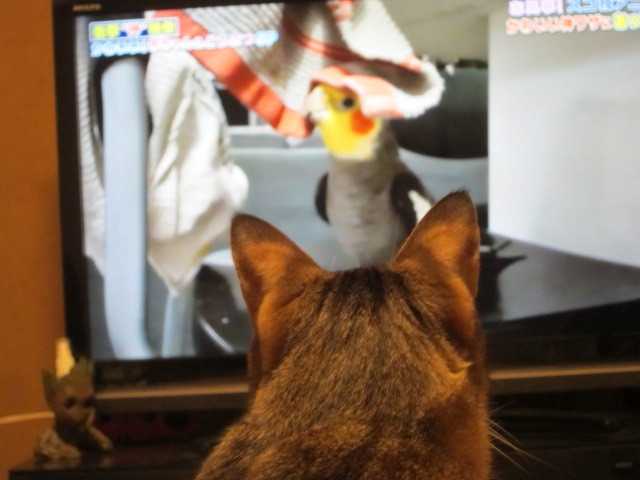 niaは普段TVに興味が無いのだが鳥が出て鳴いていると気になるらしく画面をじーっと見つめる本能で追ってしまうのだろうか