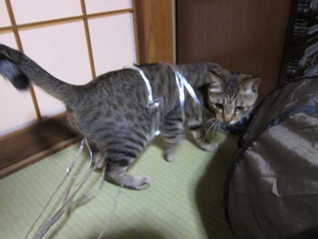 廊下にある収納開けてビニール紐を出して遊んでいたらしい隣の部屋でドタバタニャーニャー聞こえるので行ってみたらこの有様絡まっていたビニール紐を外してあげた久々のいたずらだねちょっとは反省して…ないなまだ遊び足りないのかい