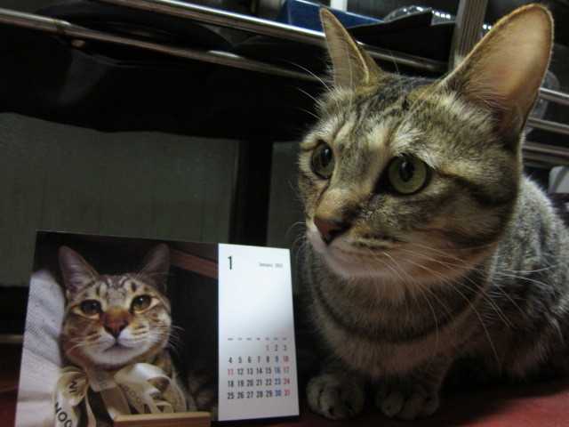 制作したniaの2021年カレンダーをキッチンに置いたらniaが横にやってきたniaとniaだかわいいなー