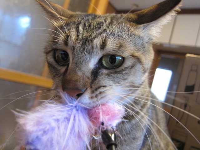 新しいおもちゃを咥えて離さないさすが本物の七面鳥の羽毛だね食いつきがいいよ珍しくウーウー言ってる君は犬かこれは僕のにゃ横取りするんじゃにゃいよ絶対渡さないのにゃーー気にいったみたいでよかったわ顔がワイルドだわね