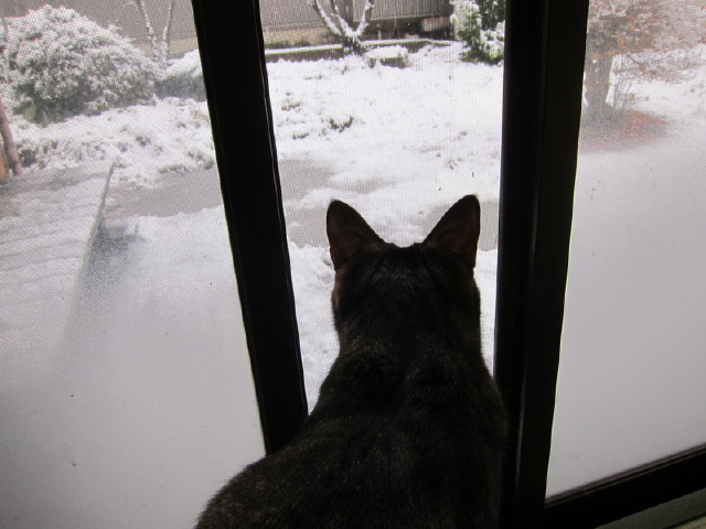 ここ数日雪マークでしたが実際には雨ばかり降っていました今日は雨マークだったのに雪が降りましたハズレばっかや。どうなってるん私にくっついて部屋から出てきたniaはほんの少し庭を眺めただけできびすを返し暖かい部屋にリターンw去年までは寒くても家中走っていた気がするんだが…niaは現在5歳6か月。年寄りではないが若くもないもんね寒い日は暖かい部屋でのんびりと過ごしてくださいな