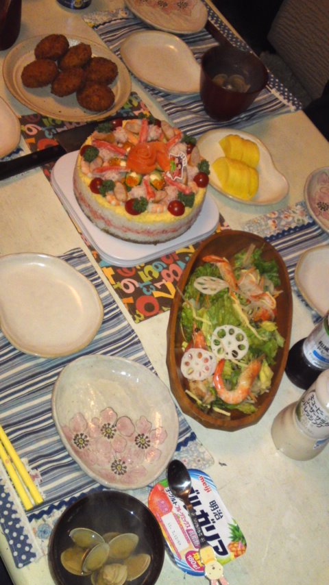 ちらし寿司のケーキにサラダ、コロッケに潮汁…